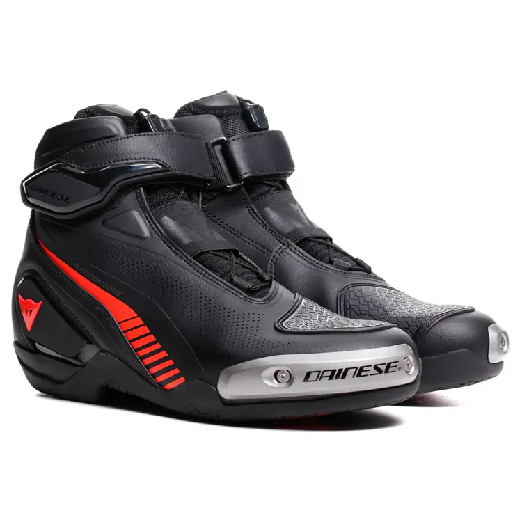 The Dainese Superya Sports Shoes deliver racing-level performance in a lightweight, street-ready form. Designed for riders who want aggressive styling and uncompromising protection, they feature a ventilated microfiber upper with racing graphics and strategically placed stretch inserts for comfort and easy entry. Magnesium sliders at the toe and ankle, reinforced heel structure, and thermoformed ankle protection offer high-impact safety in key zones. A secure fit is ensured with the Quicklace System, hidden lace pocket, and Velcro strap. For all-day support, the OrthoLite® insole and asymmetric Groundtrax® racing sole provide outstanding comfort, control, and sensitivity - on and off the bike.