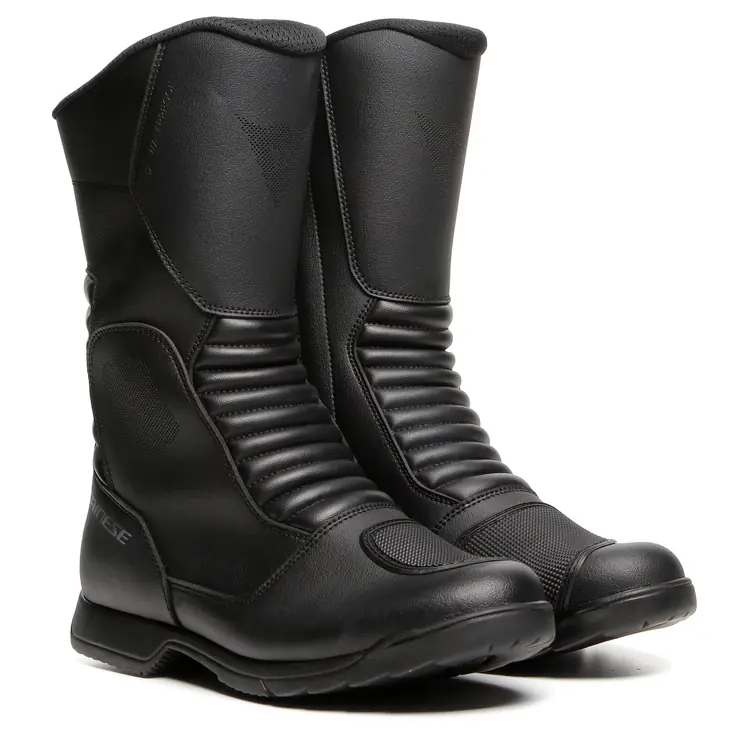Certified waterproof touring boots with D-WP membrane, flexible panels, and breathable construction for all-season riding.