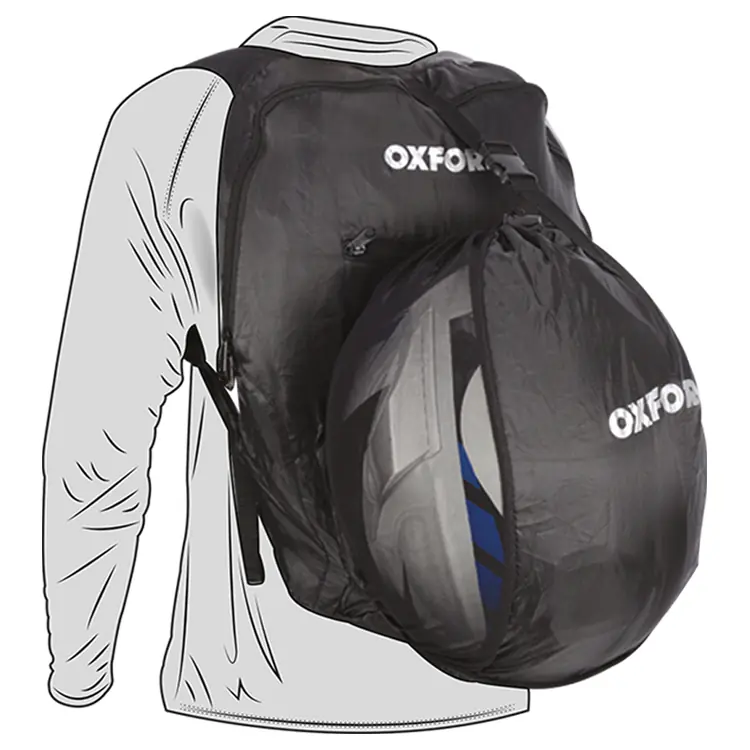 Oxford’s 15L foldable backpack with integrated helmet holder, key clip, and compact pack-away design.